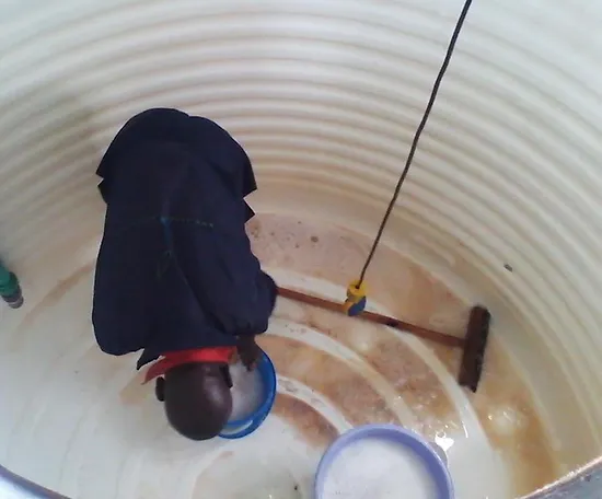 • تبدأ خطوة فرك وتنظيف جدران الخزان والأرضية والسقف بشكل دقيقة بادوات مناسبة لا تخدش أو تضر بالخزان.